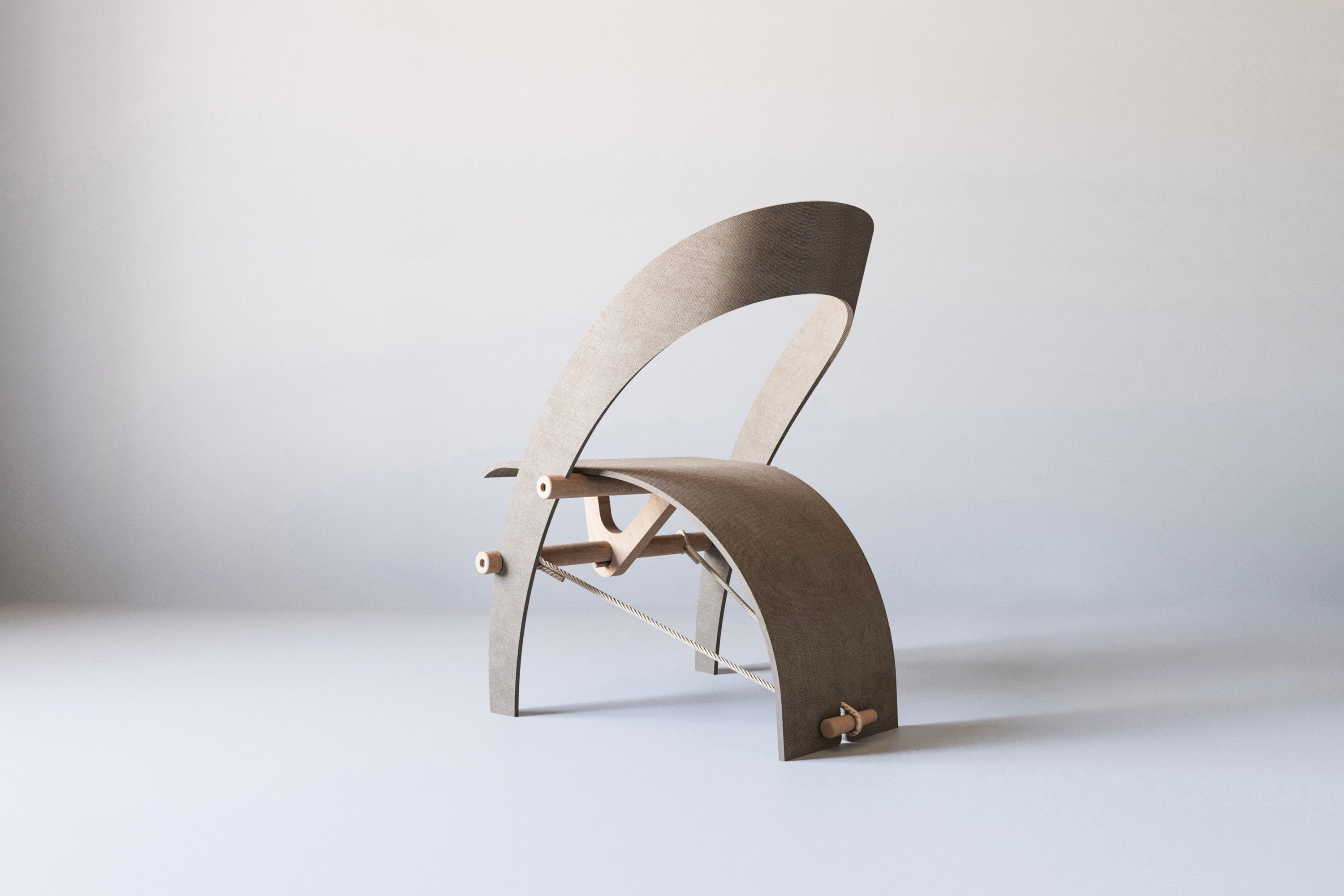The Hemp Chair’s structural stability emerges from curved elements counterbalancing under load, forming a continuous surface that is both skin and support. There is no hierarchy between the two, and no hidden frame.